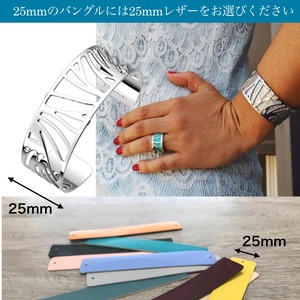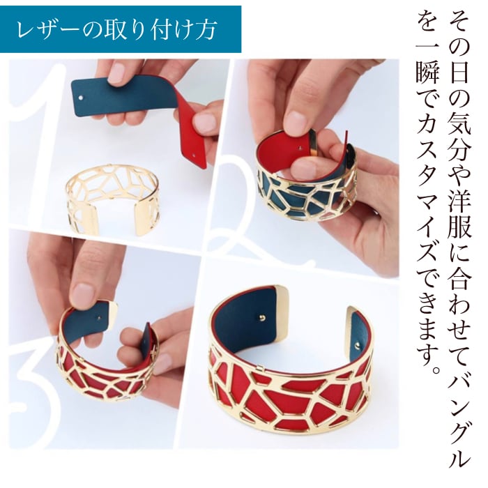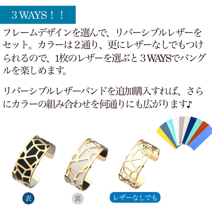 バングルの中に25mmカラーレザーを入れると、2色のリバーシブルレザーと合わせて透けたメタルの身の状態の合計3WAYで素敵なバングルをお楽しみいただけます♪